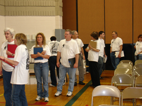 After being assessed, individuals headed over to the gym where each person was paired up with a chaperone who guided them through the very large building, helping them find the services that they needed. They were also given the opportunity to eat and shower. Four hundred breakfasts and twelve hundred lunches were prepared that day.